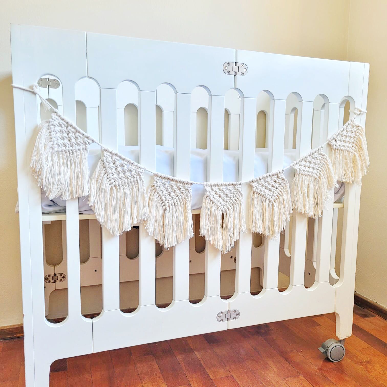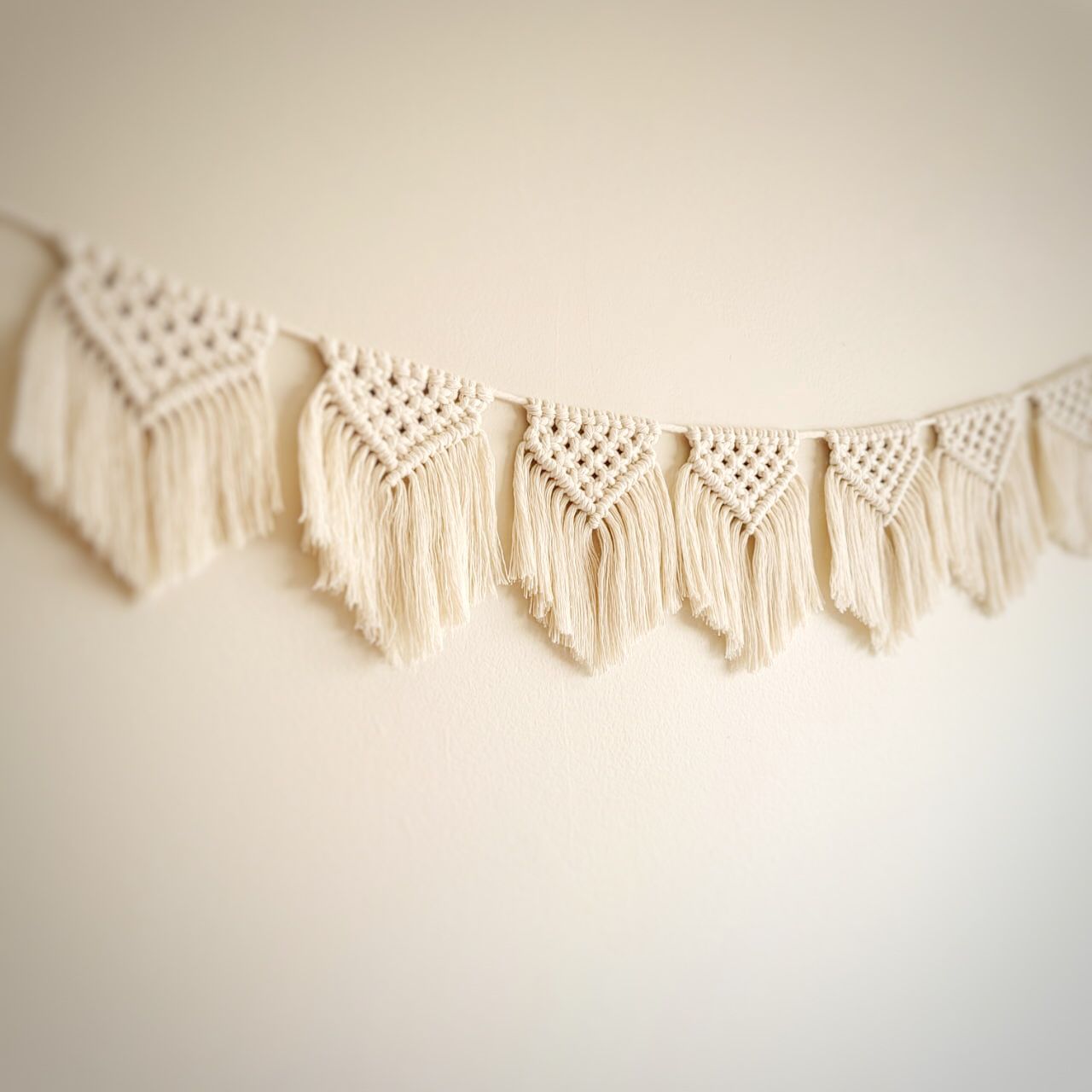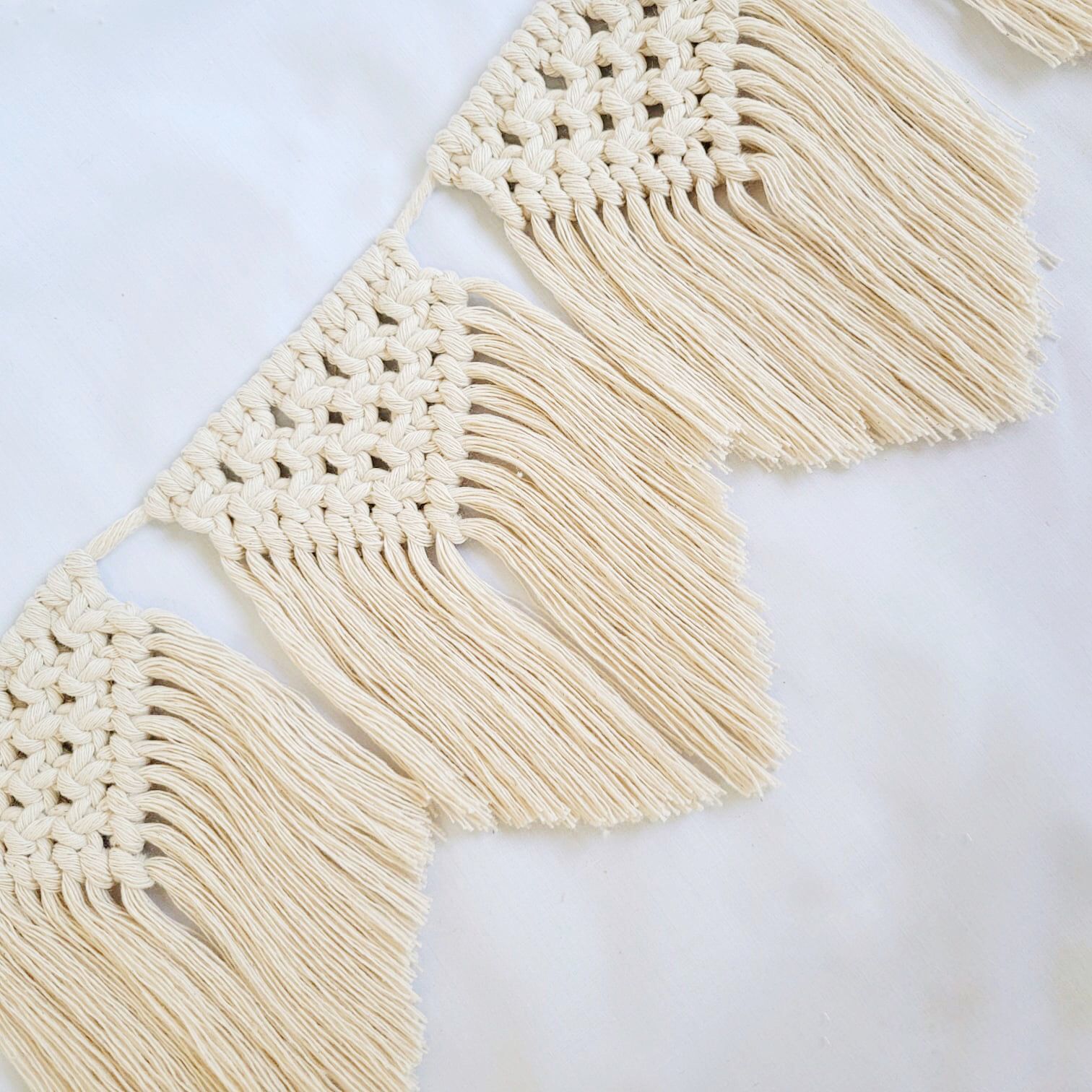 Guirnalda decorativa realizada a mano en macramé con hilo de algodón. Tiene 7 banderines individuales de 15 cm de largo por 10 cm de ancho cada uno.